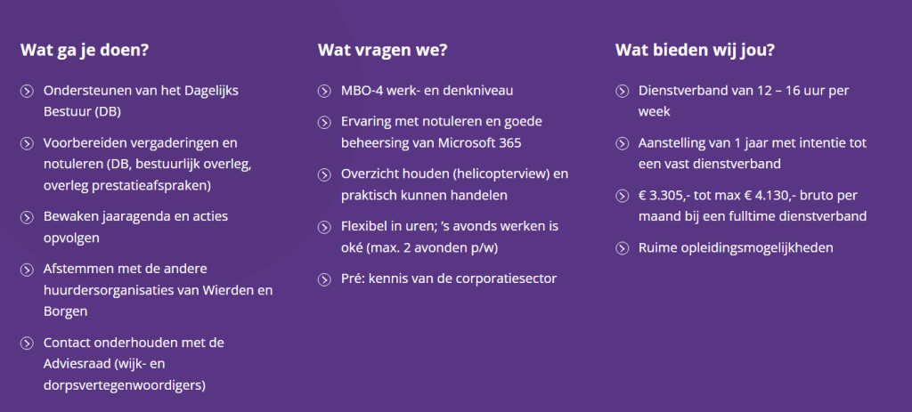 Je helpt het Dagelijks Bestuur om de stem van huurders krachtig te laten klinken. Met jouw organisatiekracht, heldere stukken en strakke agendering draag je bij aan goede gesprekken met Wierden en Borgen en onze partners.